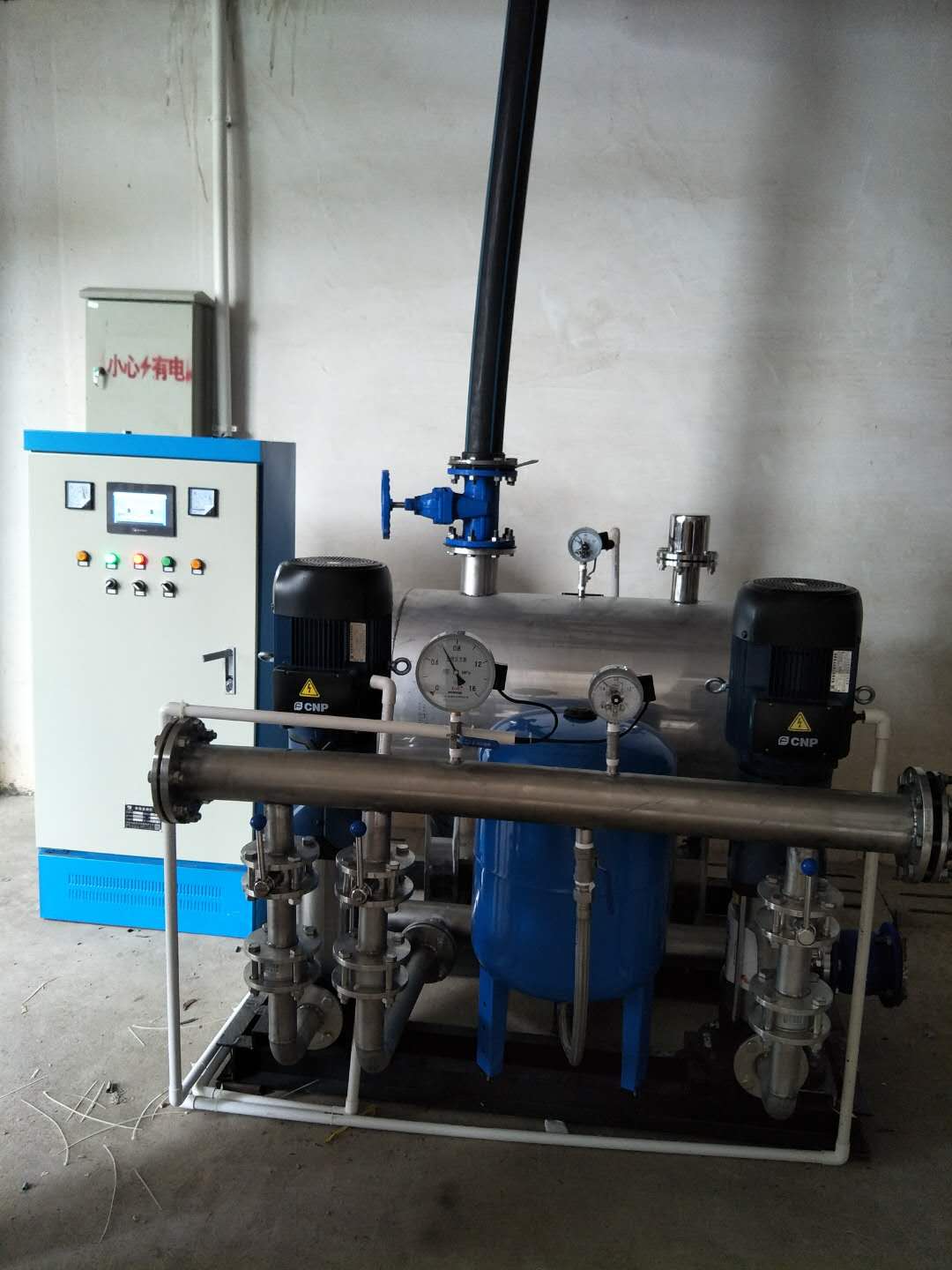 2018.5.14,長(zhǎng)和平縣興平水電開(kāi)發(fā)有限公司第三次與我司合作,簽訂供水設(shè)備購(gòu)銷(xiāo)合同,用于小區(qū)生活供水,次項(xiàng)目有設(shè)計(jì)院提供設(shè)計(jì)圖紙,我司技術(shù)員根據(jù)現(xiàn)場(chǎng)情況及多年技術(shù)檢驗(yàn)設(shè)計(jì)一套無(wú)負(fù)壓變頻供水設(shè)備,型號(hào)ZYW50-50-5.5-2,配兩臺(tái)5.5kw不銹鋼加壓泵,一用一備。