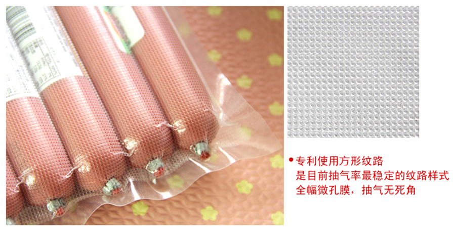 1、袋子內(nèi)側(cè)有網(wǎng)狀紋路空氣通道,99.99%抽真空無死角。